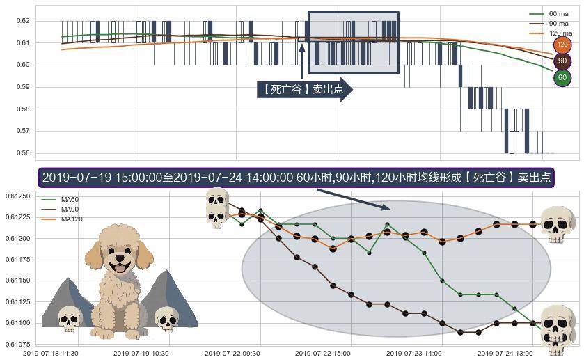 形态多维评估: ⚀ 2019-07-22 09:30:00-小时至2019-07-24 14:00:00-小时显现 60小时-90小时-120小时均线 【死亡谷】卖出点 看空信号,后市看跌,卖出