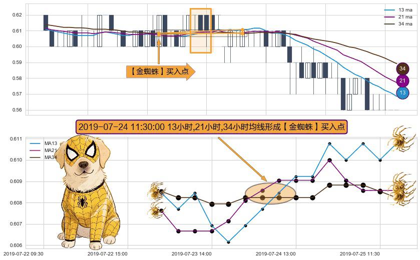 形态多维评估: ⚀ 2019-07-24 11:30:00小时显现 13小时-21小时-34小时均线 【金蜘蛛】买入点 看多信号,后市看涨,买入