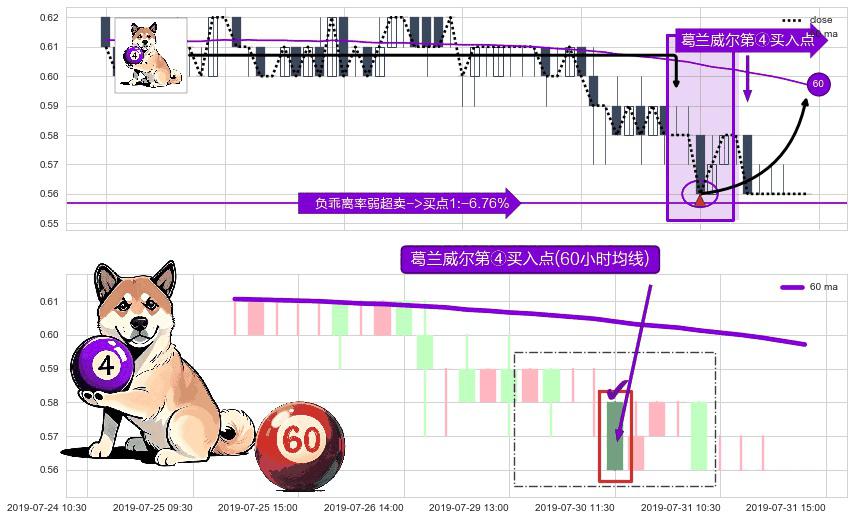 形态多维评估: ⚀ 2019-07-30 11:30:00-小时显现 葛兰威尔均线 60小时均线 第④买入点 下降趋势均值回复的短线反弹信号,后市看涨,买进信号