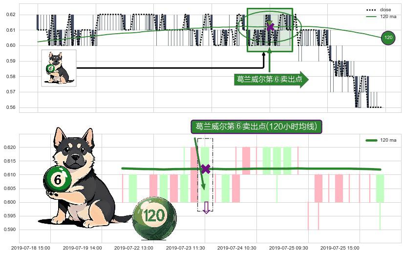 形态多维评估: ⚀ 2019-07-23 11:30:00-小时显现 葛兰威尔均线 120小时均线 第⑥卖出点 走势反转见顶信号,后市看跌,卖出信号