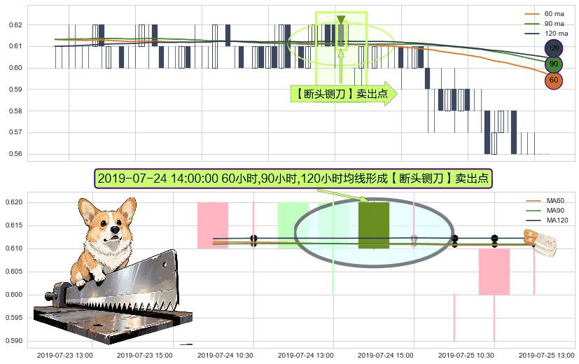 形态多维评估: ⚀ 2019-07-24 14:00:00小时显现 60小时-90小时-120小时均线 【断头铡刀】卖出点 看空信号,后市看跌,卖出