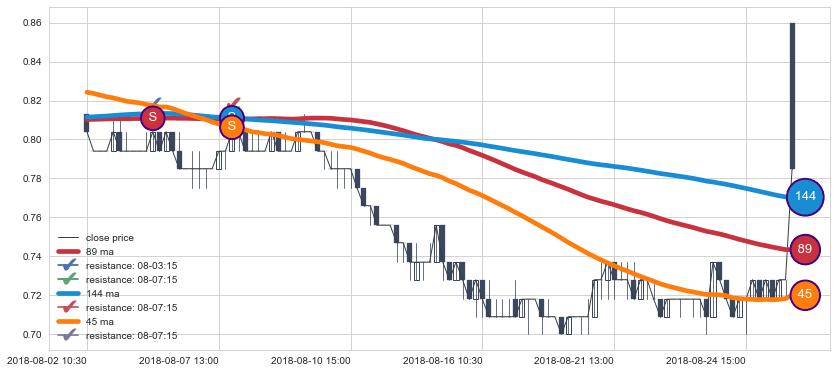 下跌趋势08-02 10:30-08-30 09:30,均线144, 89, 45确认关键阻力2处