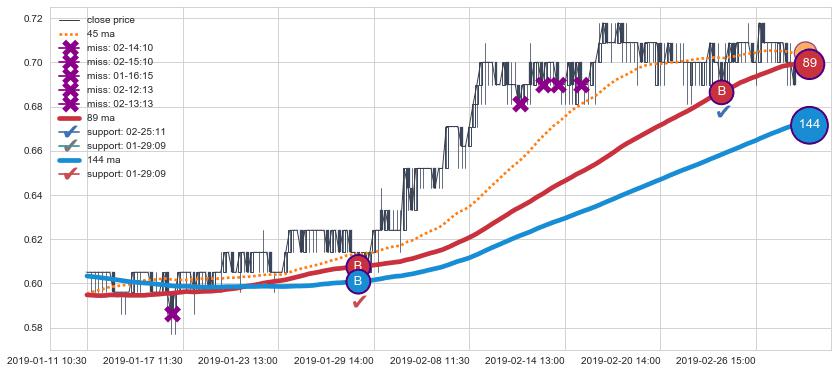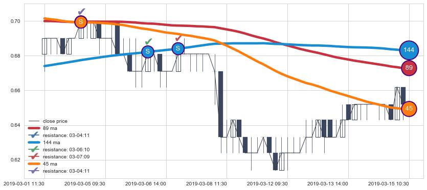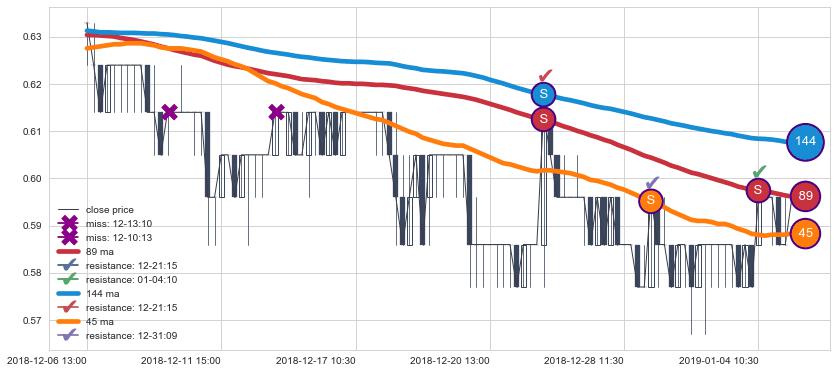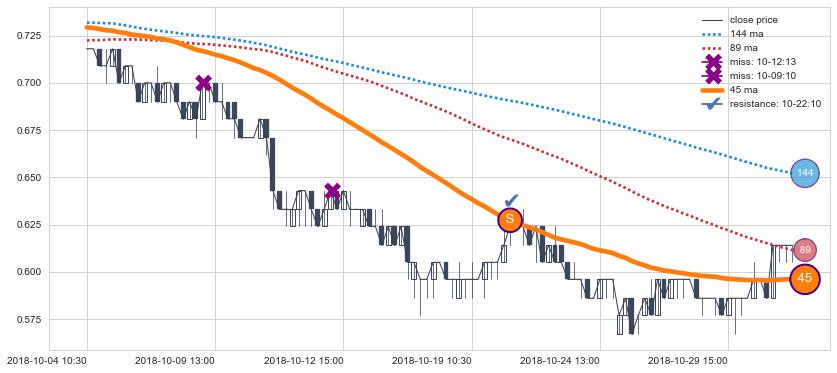 下跌趋势03-01 11:30-03-15 10:30,均线144, 89, 45确认关键阻力3处