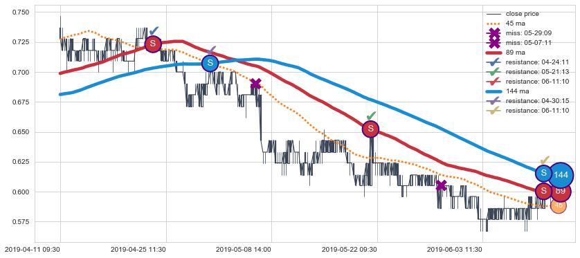 下跌趋势04-11 09:30-06-11 14:00,均线144, 89确认关键阻力4处