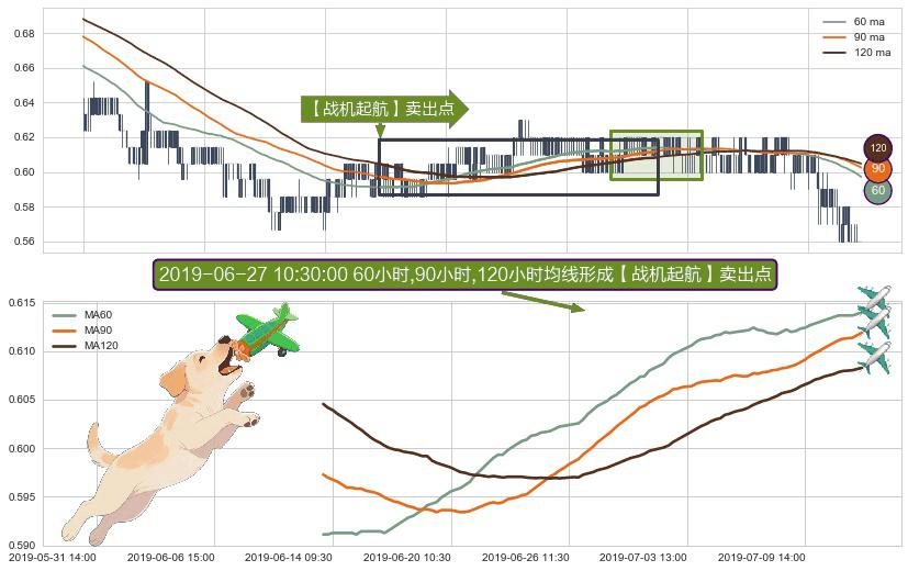 形态多维评估: ⚀ 2019-06-13 14:00:00小时-2019-07-11 14:00:00小时显现 60小时-90小时-120小时均线 【战机起航】卖出点 看空信号,后市看跌,卖出