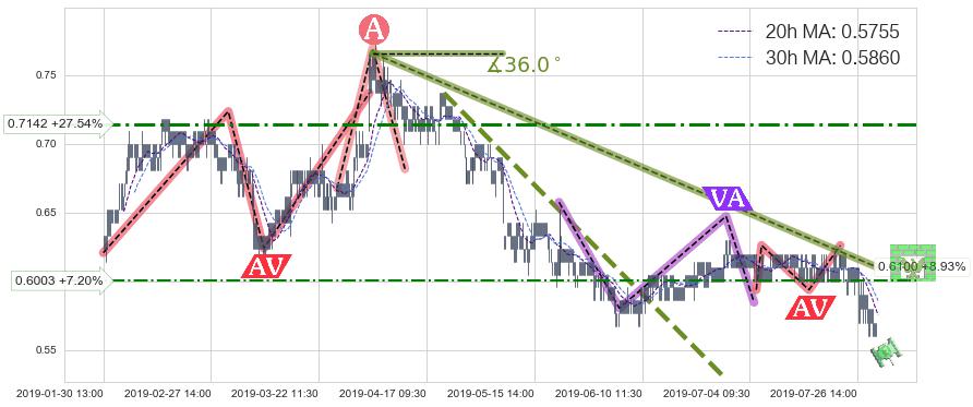 ♘ 在最后的下跌阶段2019-04-03 14:00至2019-07-31 15:00,存在 持续未破位的阻力位 ,阻力价格0.6100,可信任强度80.67%,其距离最后价格0.5600相差 +8.93%