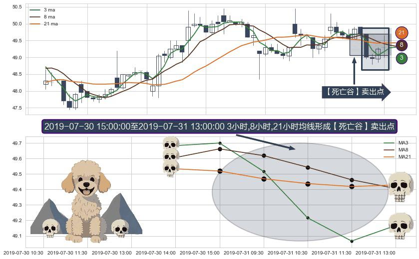 ⚀ 2019-07-31 09:30:00-小时至2019-07-31 13:00:00-小时显现 3小时-8小时-21小时均线 【死亡谷】卖出点 看空信号,后市看跌,卖出