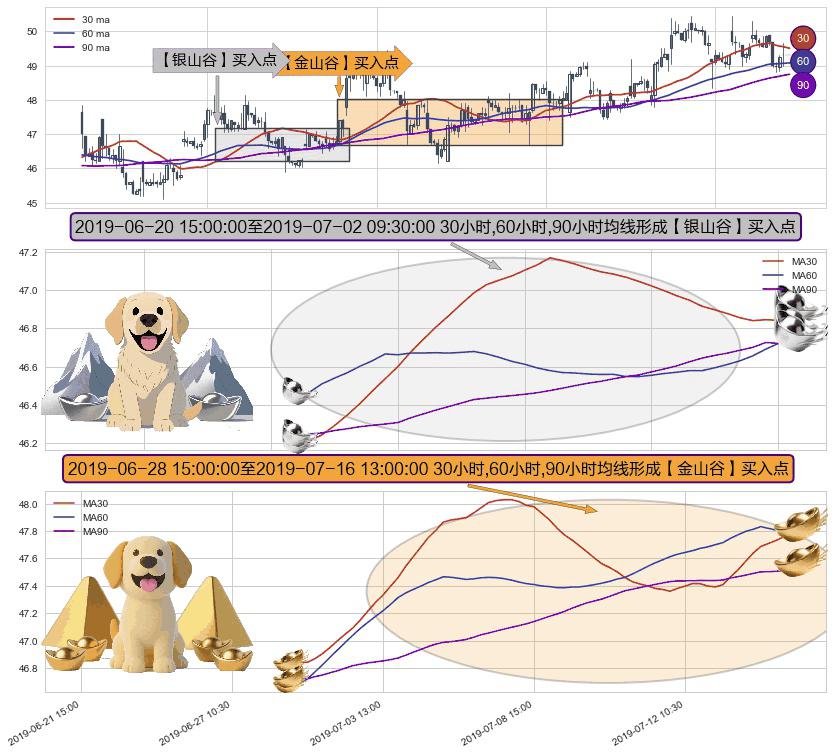 ⚀ 2019-07-02 09:30:00-小时至2019-07-16 13:00:00-小时显现 30小时-60小时-90小时均线 【金山谷】买入点 其再次确认了买入信号,可靠性更强,买入