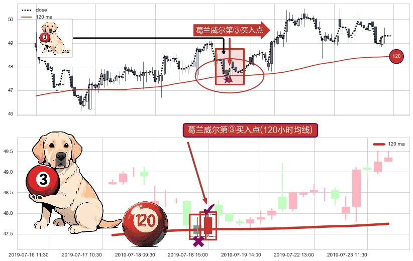 ⚀ 2019-07-18 15:00:00-小时显现 葛兰威尔均线 120小时均线 第③买入点 上升趋势的中继信号,后市看涨,买进信号