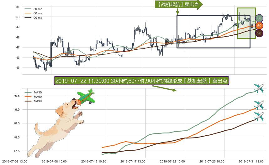 ⚀ 2019-07-11 15:00:00小时-2019-07-30 15:00:00小时显现 30小时-60小时-90小时均线 【战机起航】卖出点 看空信号,后市看跌,卖出