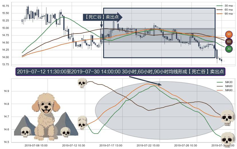 ⚀ 2019-07-12 13:00:00-小时至2019-07-30 14:00:00-小时显现 30小时-60小时-90小时均线 【死亡谷】卖出点 看空信号,后市看跌,卖出