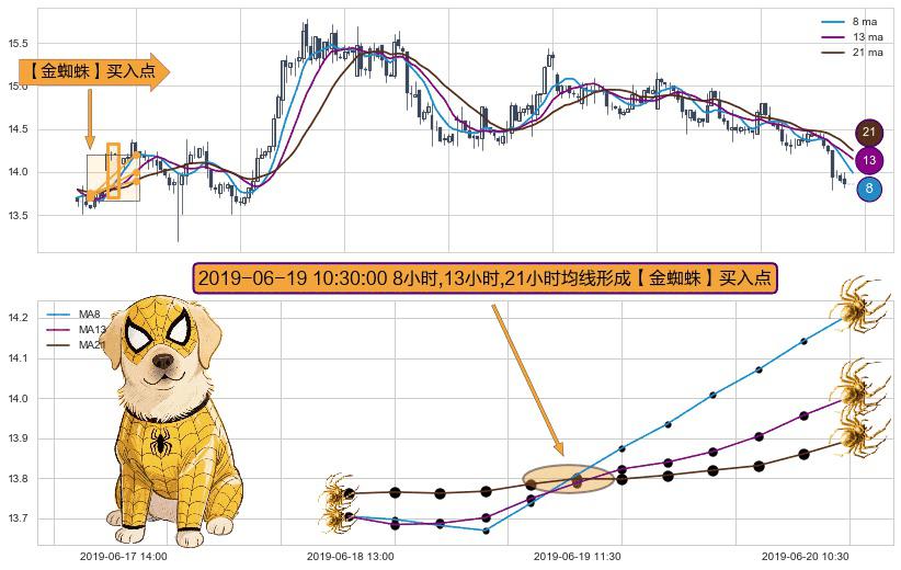 ⚀ 2019-06-19 10:30:00小时显现 8小时-13小时-21小时均线 【金蜘蛛】买入点 看多信号,后市看涨,买入
