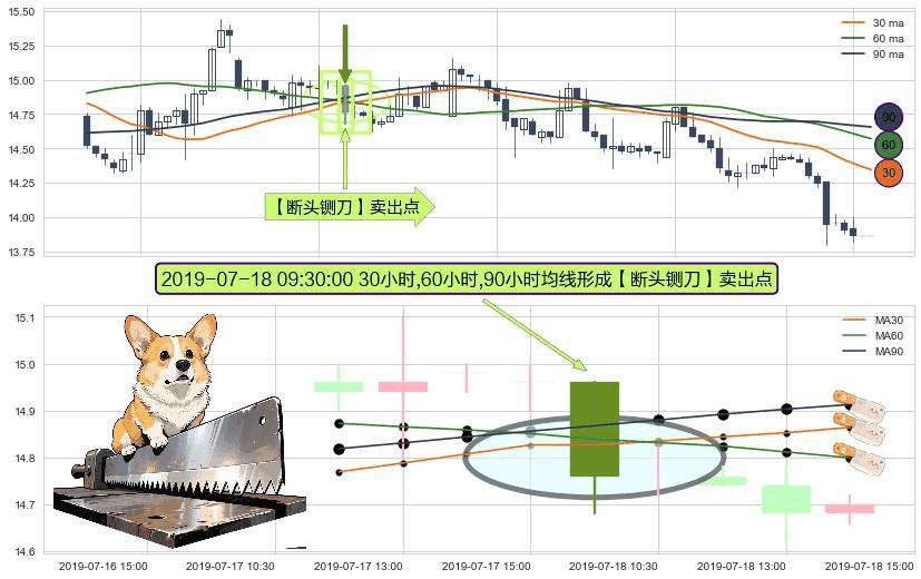 ⚀ 2019-07-18 09:30:00小时显现 30小时-60小时-90小时均线 【断头铡刀】卖出点 看空信号,后市看跌,卖出