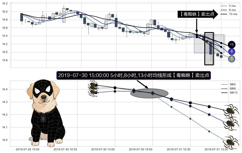 ⚀ 2019-07-30 15:00:00小时显现 5小时-8小时-13小时均线 【毒蜘蛛】卖出点 看空信号,后市看跌,卖出