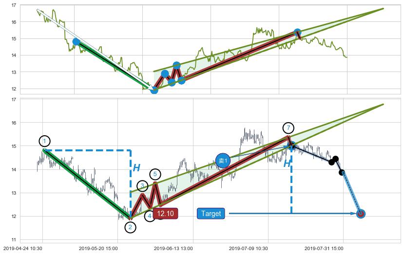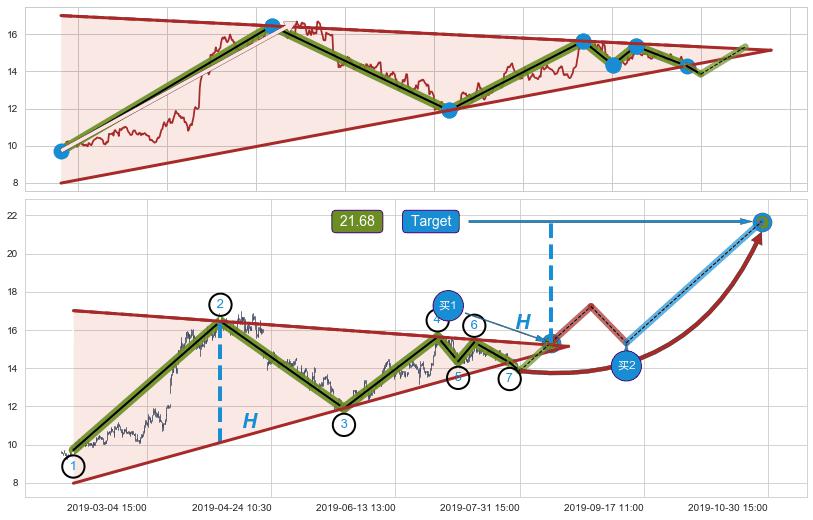 ➢ 最小中继整理涨幅→𝐇: 6.35 (高点逐步降低斜边第一阻力点②与支撑边垂直距离)