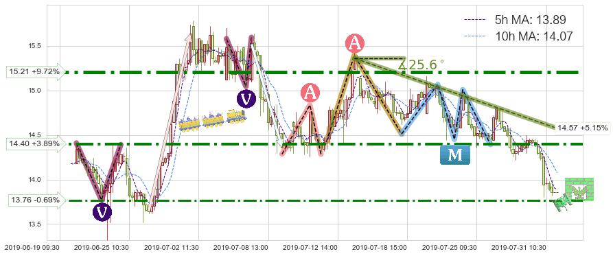 ➣ 预测:2019-08-13 10:00,【继续下探】稳定目前下跌趋势的前提下,预测价格:13.62