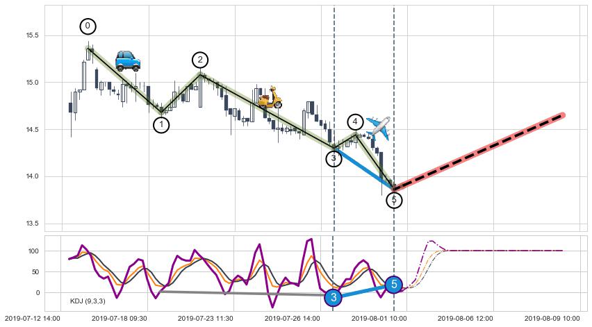 ➣ 第三,五驱动浪端点:【KDJ】走势出现【常规背离 & 反转信号】背离程度65.69%,背离夹角角度67.6˚,背离程度较大
