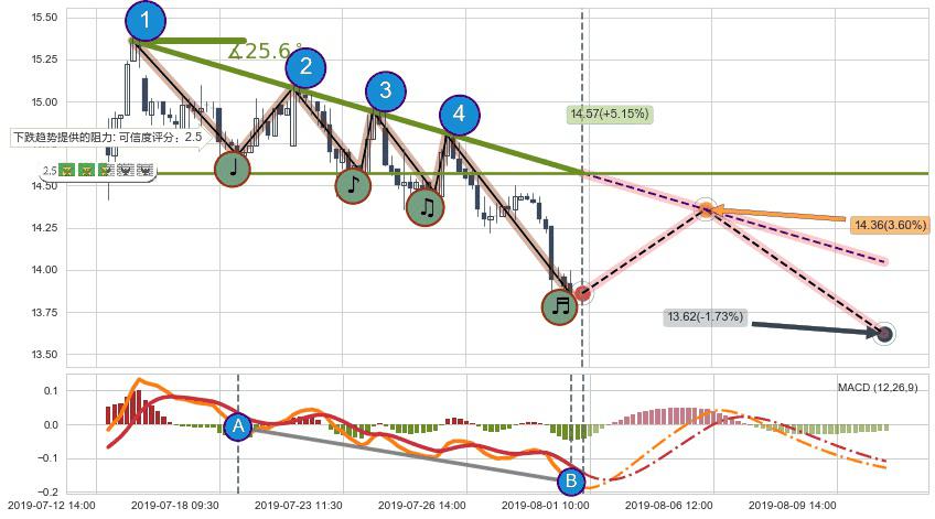 ➢ 预测:2019-08-06 11:00,【小幅反弹】稳定目前下跌趋势的前提下,预测价格:14.36