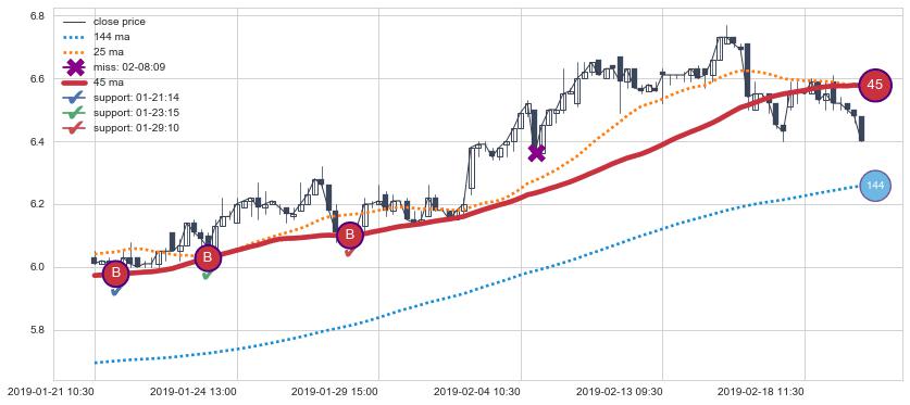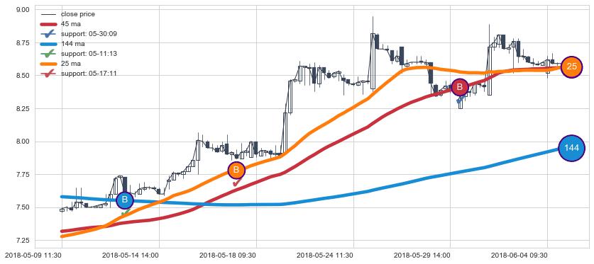 上涨趋势05-09 11:30-06-04 13:00,均线144, 25, 45确认关键支撑3处
