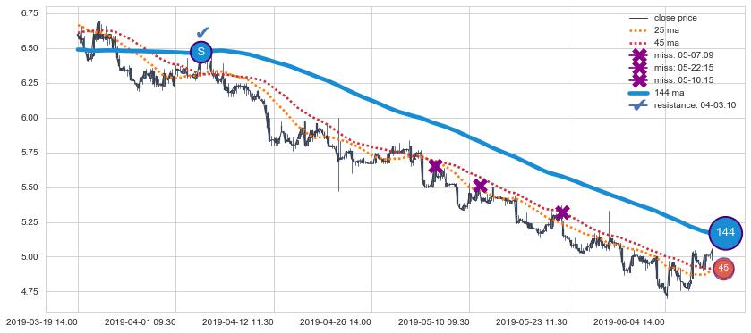 下跌趋势03-19 14:00-06-11 14:00,均线144确认关键阻力1处