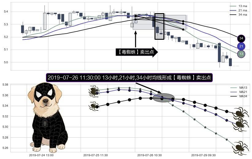形态多维评估: ⚀ 2019-07-26 11:30:00小时显现 13小时-21小时-34小时均线 【毒蜘蛛】卖出点 看空信号,后市看跌,卖出