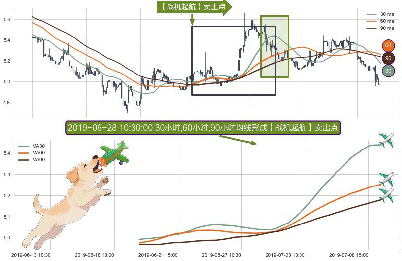 形态多维评估: ⚀ 2019-06-19 15:00:00小时-2019-07-09 13:00:00小时显现 30小时-60小时-90小时均线 【战机起航】卖出点 看空信号,后市看跌,卖出