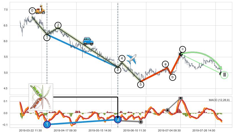 从2019-06-26 10:30至2019-07-31 15:00,共包含149个小时,阶段股价上涨0.64%,阶段股价变动位移路程比: 1 : 118