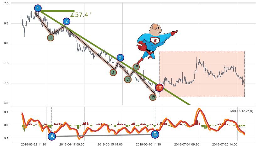 从2019-03-15 15:00至2019-06-12 11:30,共包含340个小时,阶段股价下跌-26.85%,阶段股价变动位移路程比: 1 : 6,下跌趋势角度: 57.4