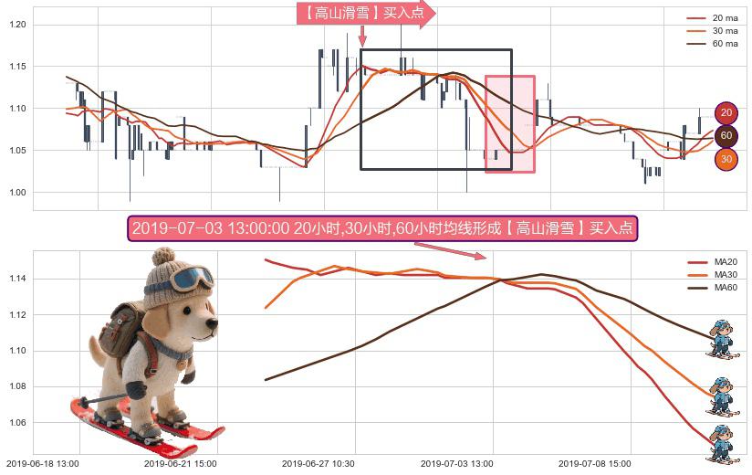 ⚀ 2019-06-25 09:30:00小时-2019-07-10 15:00:00小时显现 20小时-30小时-60小时均线 【高山滑雪】买入点 看多信号,后市看涨,买入