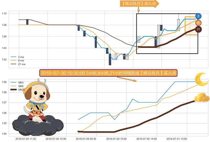 ⚀ 2019-07-26 13:00:00小时-2019-07-31 15:00:00小时显现 3小时-8小时-21小时均线 【烘云托月】买入点 看多信号,后市看涨,买入