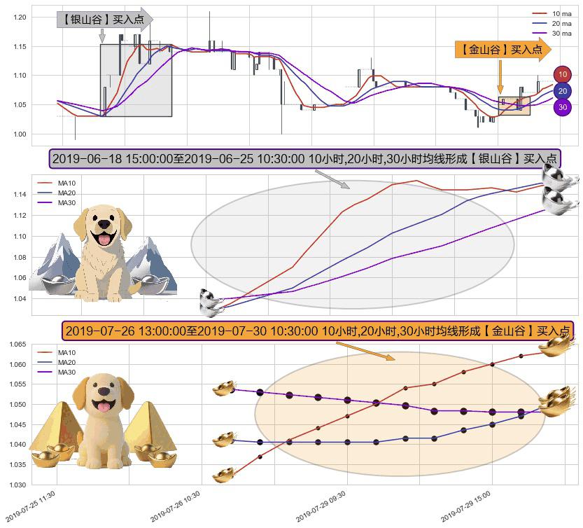 ⚃ 2019-07-26 14:00:00-小时至2019-07-30 10:30:00-小时显现 10小时-20小时-30小时均线 【金山谷】买入点 其再次确认了买入信号,可靠性更强,买入