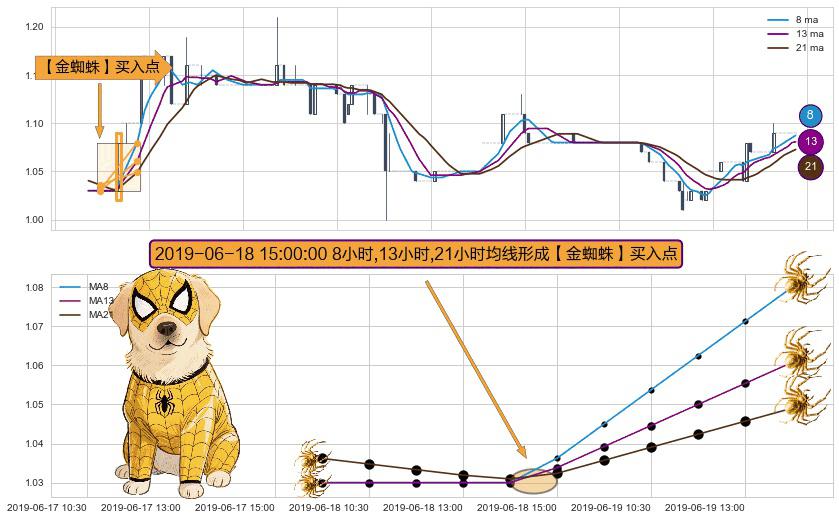 ⚀ 2019-06-18 15:00:00小时显现 8小时-13小时-21小时均线 【金蜘蛛】买入点 看多信号,后市看涨,买入