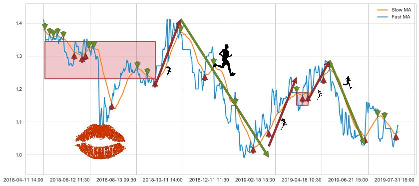 03-15 14:00至03-29 15:00 慢线与快线多次接触,存在上下穿越,有缠绕