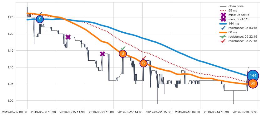 05-02 11:30至06-19 09:30 慢线与快线呈空头排列, 慢线与快线接触少,无缠绕