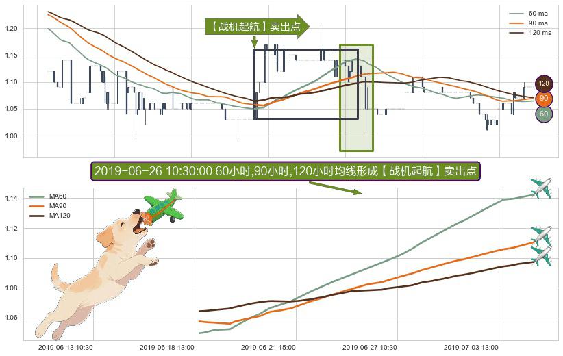 ⚀ 2019-06-18 14:00:00小时-2019-07-04 14:00:00小时显现 60小时-90小时-120小时均线 【战机起航】卖出点 看空信号,后市看跌,卖出
