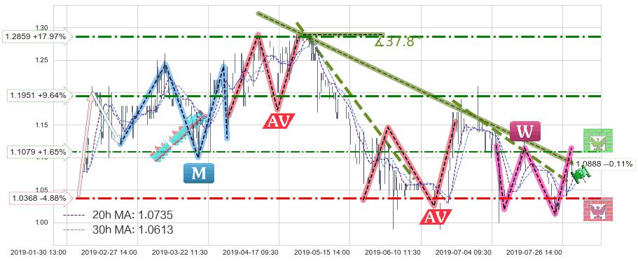 🦴 长线均值回复组合短线趋势跟踪[强阻力信号]2019-04-10 10:30-2019-07-30 14:00下跌趋势依然成立(下跌趋势跟踪依然存在),短线价格略微上行反弹(均值回复猜想),即将接近下跌趋势提供的未破位阻力价格:1.0888。