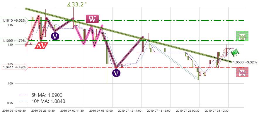 ➣ 2019-06-19 09:30-2019-07-26 11:30下跌趋势存在反转上涨[机会],其原下跌趋势的阻力位(1.0538)已被突破[强支撑信号],原下跌趋势角度: 33.2˚