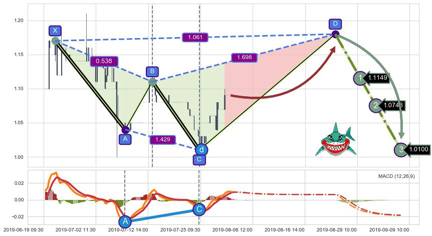 ➢ 距离预测D点位置尚有上涨空间,短线依然【看涨】, 耐心等待看跌【鲨鱼】形态反转启动