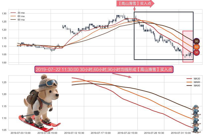形态多维评估: ⚀ 2019-07-10 14:00:00小时-2019-07-31 15:00:00小时显现 30小时-60小时-90小时均线 【高山滑雪】买入点 看多信号,后市看涨,买入