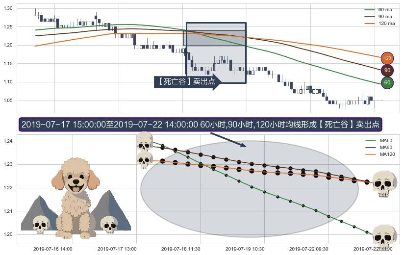 形态多维评估: ⚀ 2019-07-18 09:30:00-小时至2019-07-22 14:00:00-小时显现 60小时-90小时-120小时均线 【死亡谷】卖出点 看空信号,后市看跌,卖出