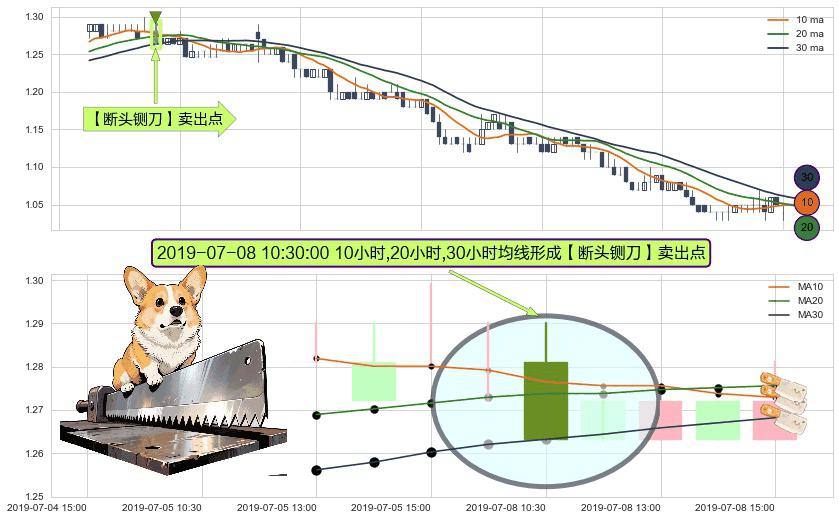 形态多维评估: ⚀ 2019-07-08 10:30:00小时显现 10小时-20小时-30小时均线 【断头铡刀】卖出点 看空信号,后市看跌,卖出