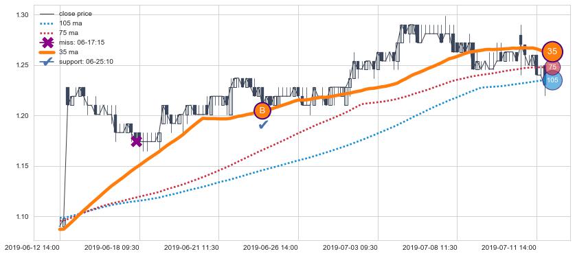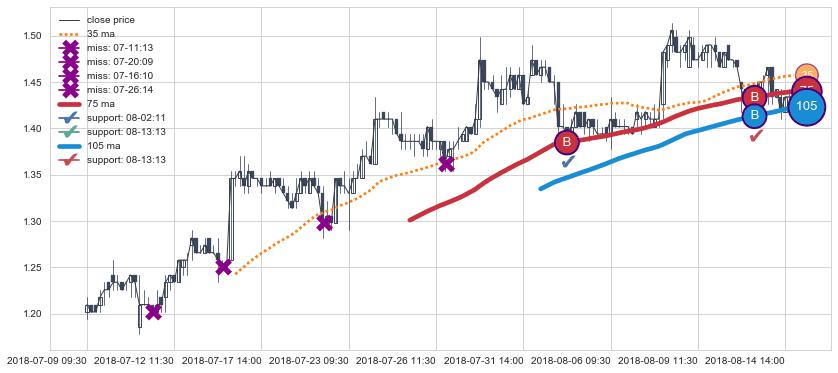 上涨趋势07-09 09:30-08-15 09:30,均线105, 75确认关键支撑2处