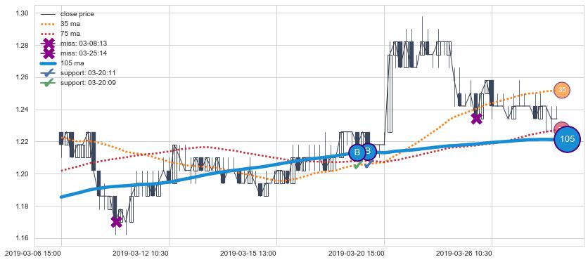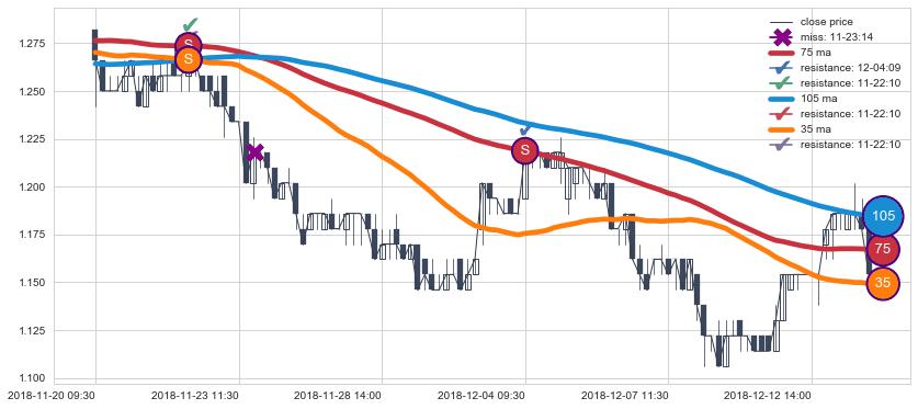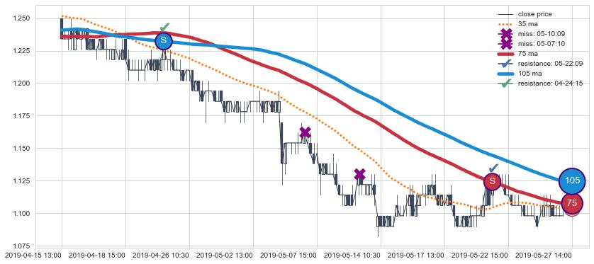 下跌趋势04-15 13:00-05-27 14:00,均线105, 75确认关键阻力2处