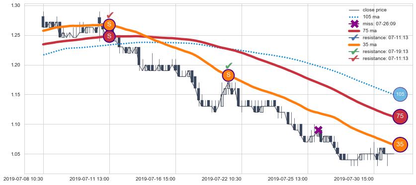 下跌趋势07-08 10:30-07-31 15:00,均线35, 75确认关键阻力2处