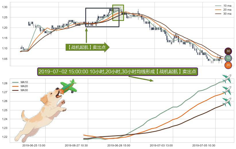 形态多维评估: ⚀ 2019-06-27 09:30:00小时-2019-07-05 13:00:00小时显现 10小时-20小时-30小时均线 【战机起航】卖出点 看空信号,后市看跌,卖出