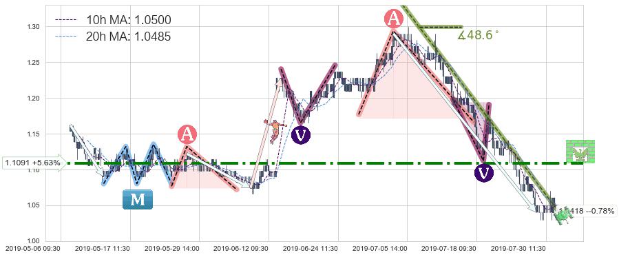 从2019-07-04 09:30至2019-07-31 14:00,共包含119个小时,阶段股价下跌-20.16%,阶段股价变动位移路程比: 1 : 3,下跌趋势角度: 48.6