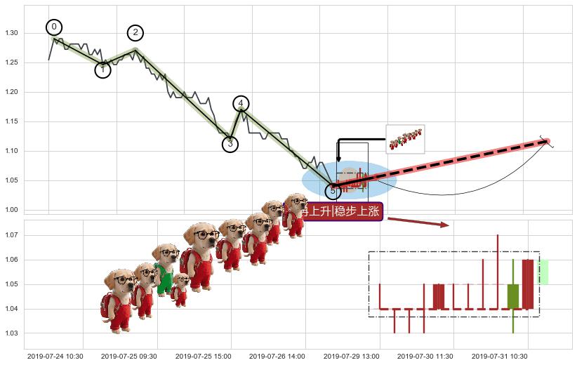 从2019-06-06 15:00至2019-06-13 13:00,共包含23个小时,阶段股价上涨13.92%,阶段股价变动位移路程比: 1 : 1.3,2019-06-13 09:30向⇪形成缺口,跳空上涨+10.20%