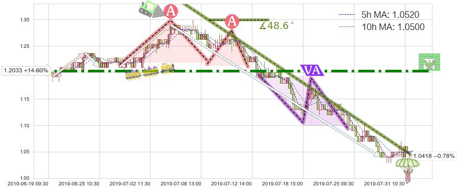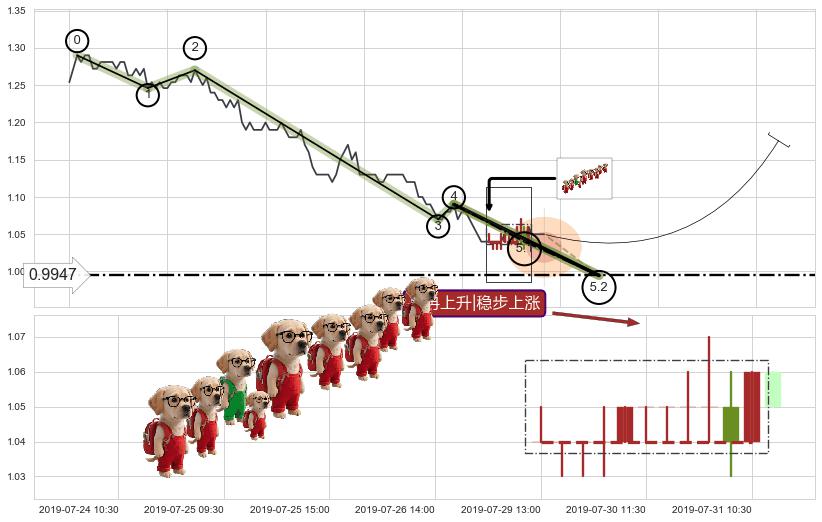 🦴 长线均值回复组合短线趋势跟踪[强阻力信号]2019-07-04 09:30-2019-07-31 09:30下跌趋势依然成立(下跌趋势跟踪依然存在),短线价格略微上行反弹(均值回复猜想),即将接近下跌趋势提供的未破位阻力价格:1.0418。