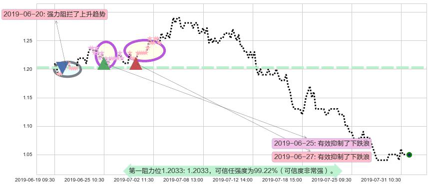 ♘ 在最后的下跌阶段2019-07-04 09:30至2019-07-31 09:30,存在 破位边缘的阻力位 ,阻力价格1.0418,可信任强度85.34%,其距离最后价格1.0500相差 -0.78%