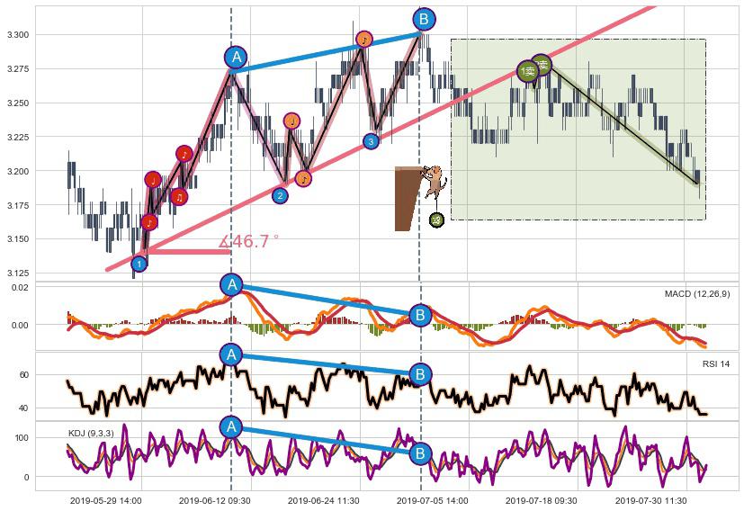 ➢ 最后的上涨趋势2019-05-27 09:30至2019-07-03 09:30:存在破位迹象,后续小调整或者反转下跌